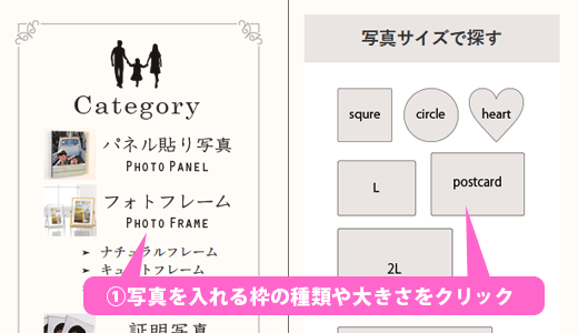 写真を入れる枠の種類(パネルやフレーム)や大きさを選んでください。